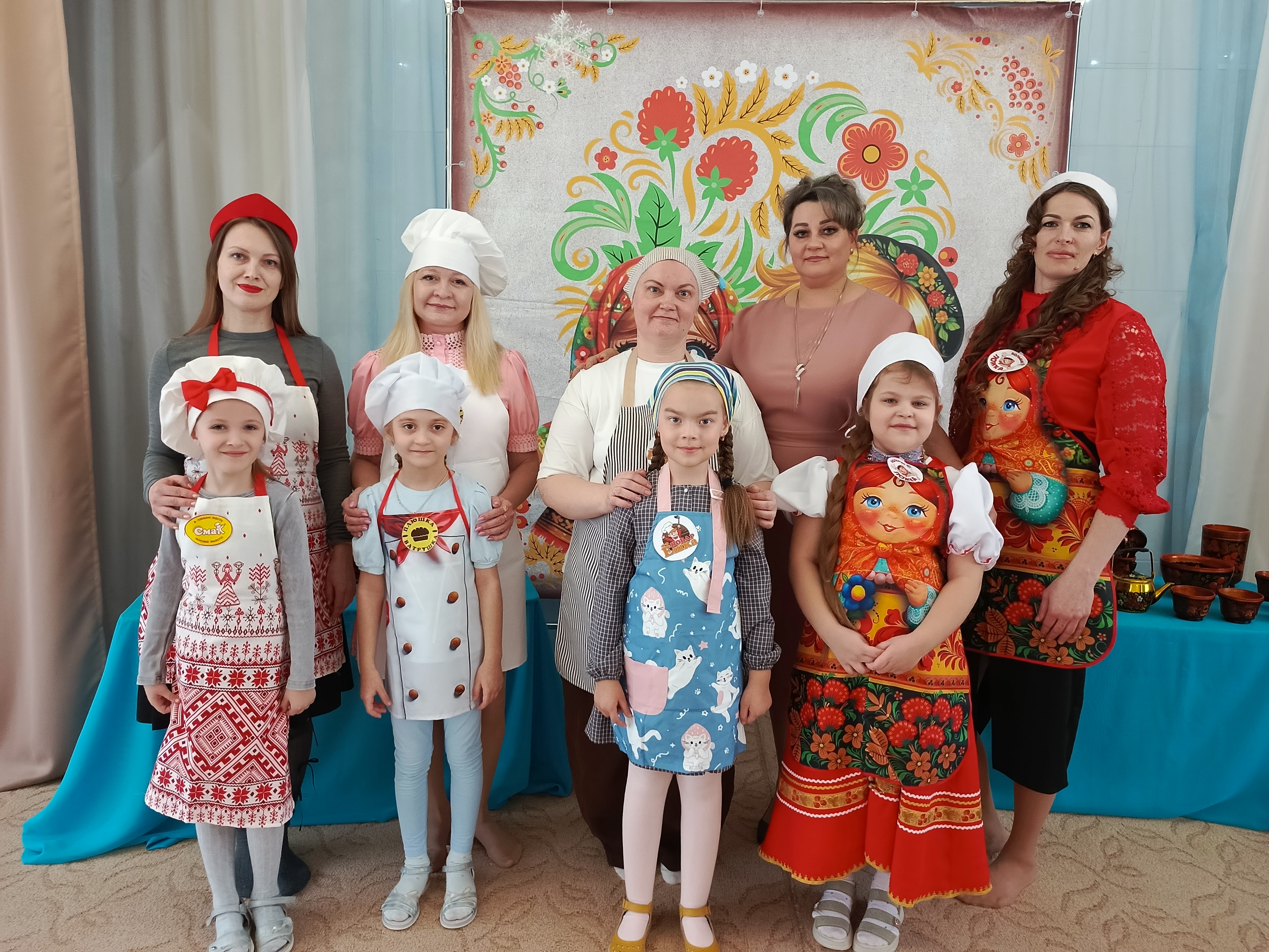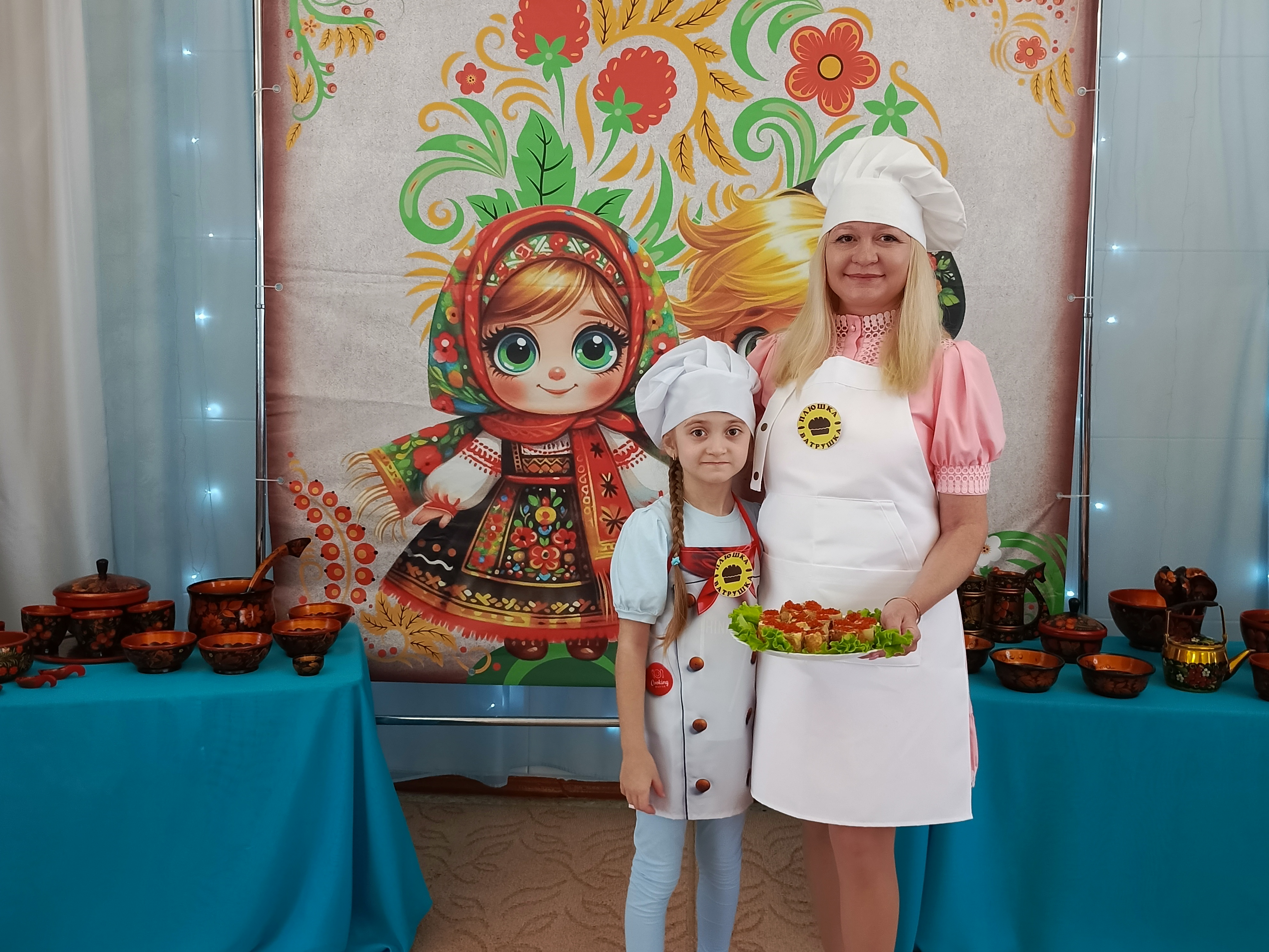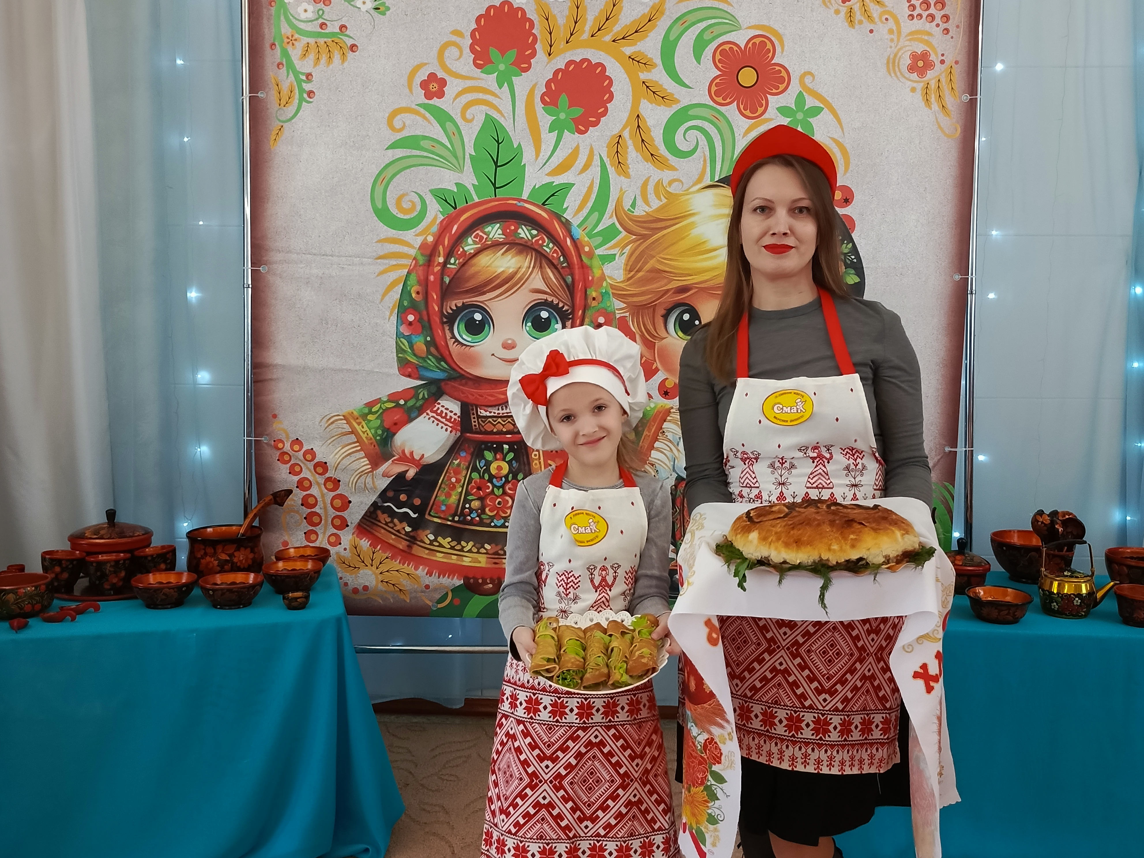 Команда «Поварёшки» удивила публику оригинальностью русских роллов, созданных Евгенией Павловной Андрецовой и её дочерью Софией. Команда «Большая ложка», которую представляли Дубовик Альбина Евгеньевна и ее дочь Мишель продемонстрировали настоящее мастерство выпечки, приготовив изысканный блинный торт "Розу". Завершали праздничное меню участники команды "Смак" Ольги Владимировны Шиловской и ее дочери Софии, которые приготовили вкусный блинный курник.