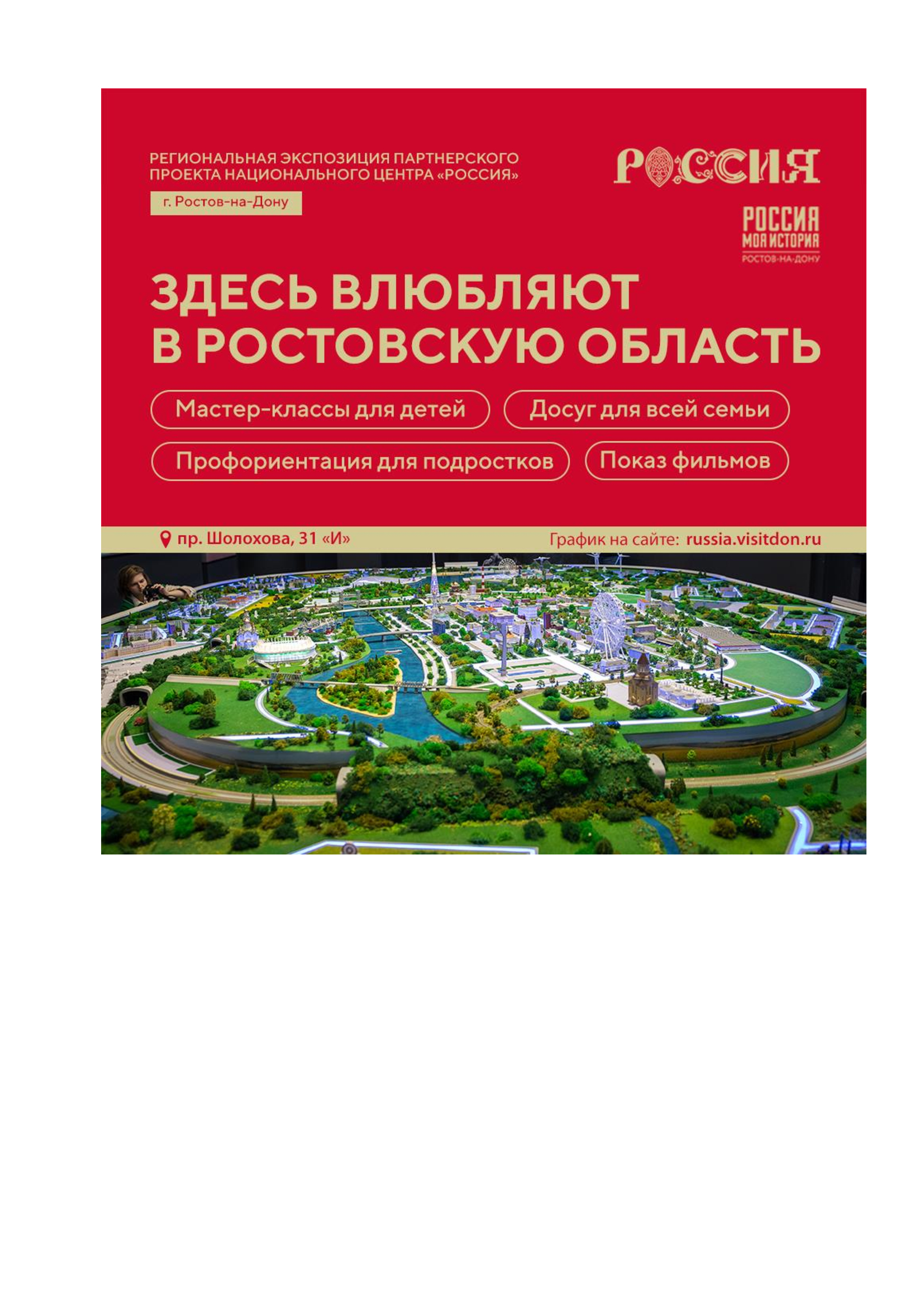 Президент России поддержал инициативу создания в каждом регионе экспозиций – наследников выставки «Россия». Проект объединяет культурное наследие страны и достижения регионов. В Ростовской области 25.01.2025 на базе парка «Россия – моя история» была запущена региональная экспозиция, полное название – региональная экспозиция партнёрского проекта национального центра «Россия». На экспозиции представлены 13 тематических площадок: от агропромышленности и цифровых технологий до туризма и волонтёрства.